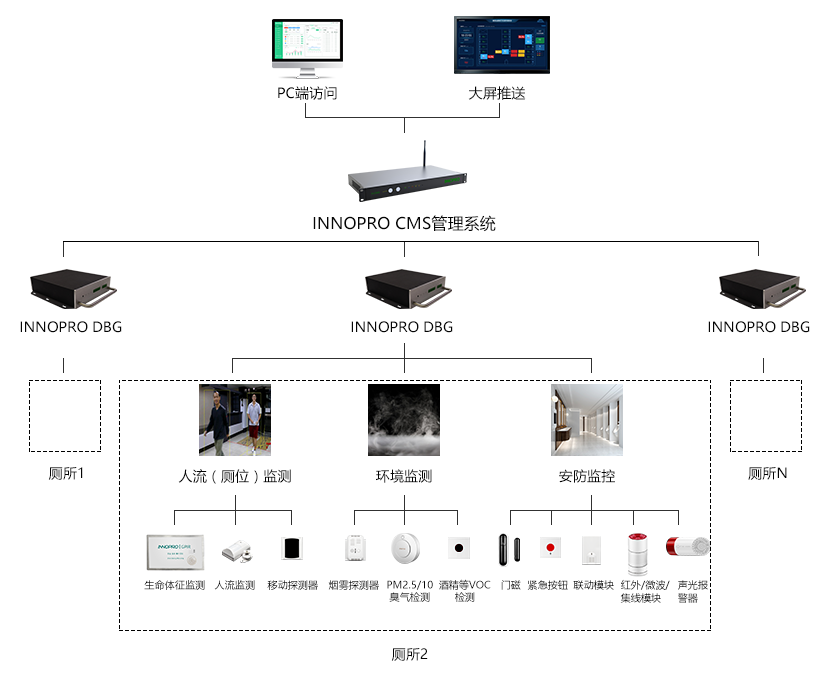 INNOPRO精华隆智慧厕所基于人、物、事的实时监测和管理,通过采用行业领先的智慧传感硬件,整合物联网、大数据、AI等前沿技术,建立智慧业务平台,提供厕位实时感知智能引导、人流监测、环境检测、生命安全监测、异常预警报警等功能,为厕位管理、卫生打扫、物资供应、突发事件等管理提升提供数据支持,实现城市厕所的智慧化管理和科学运维,有效解决了传统公厕管理脏乱差堵等问题。