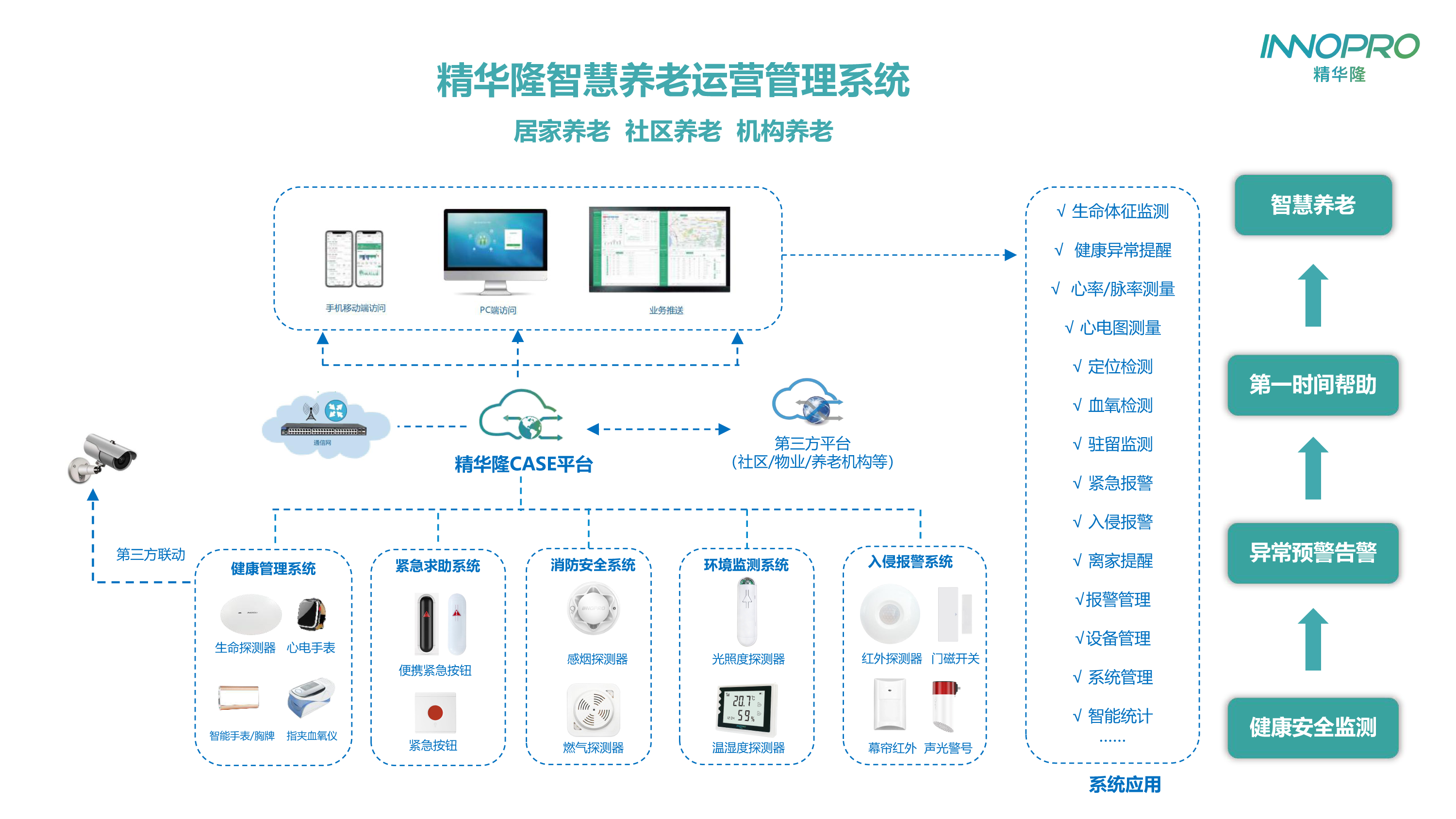 此外,精华隆智慧养老解决方案还从防盗报警、健康监测、环境等方面为老人创造一个健康、舒适的居家环境。因各种原因,我们不能陪伴在老人身边,但通过智能辅助设备,随时掌握老人的健康、安全、居家活动等情况,当出现异常状况,立即知晓,及时确定老人安全状况,并提供帮助,尽可能降低意外造成的伤害。