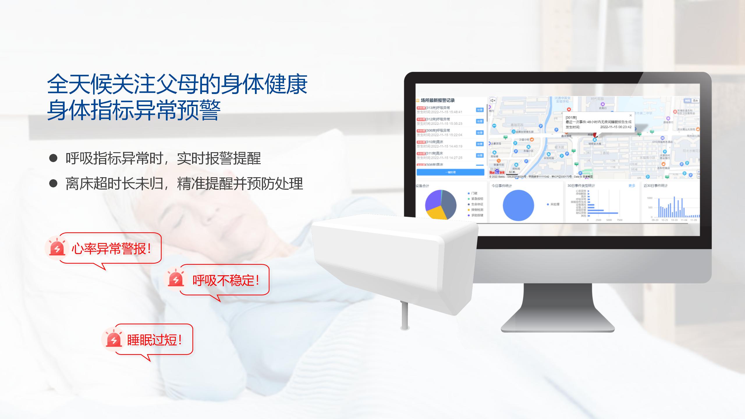 通过精华隆自主研发的毫米波雷达技术及算法,智能睡眠监测仪在不侵犯隐私的前提下采集长者的日常活动数据,进行睡眠质量分析、生命体征评估、呼吸慢病AI辅助诊疗等功能,帮助长者制定科学合理的生活规律。